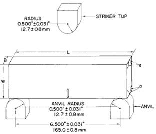 The Dynamic Tear (DT) test involves a single-edge notched beam that is impact loaded in threepoint bending, and the total energy loss during separation is recorded. The DT specimens are fractured with pendulum or drop-weight machines.